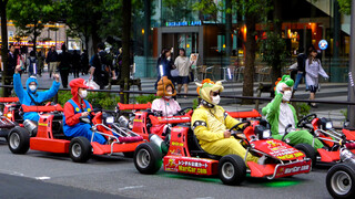Mario (and poop emoji?) go-karting. Don’t forget to wear your protective face mask.