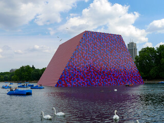 Christo's art piece made from 7,506 oil barrels, in the Serpentine lake.