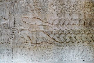 Perhaps the most notable bas relief is the churning of the sea of milk, showing the Hindu creation myth. Vishnu and others tug on Naga the serpent king, the oceans churn, and Indra descends to save the world. Note all the little sea creatures at the bottom.