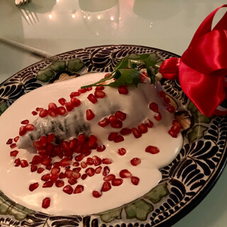 We had this dish at Azul in Condesa. It’s a seasonal autumn dish made of a pepper stuffed with meat, spices, and fruit, served with a walnut sauce and pomegranate seeds (the green, white, and red is patriotic). Interesting mix of flavors.