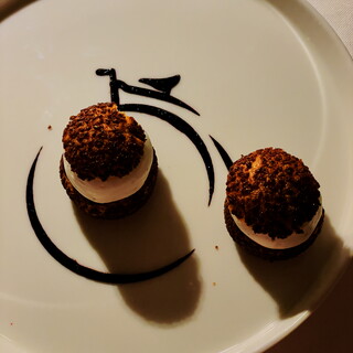 Crema chantilly alla vaniglia, ciliegie e olive nere caramellate.
